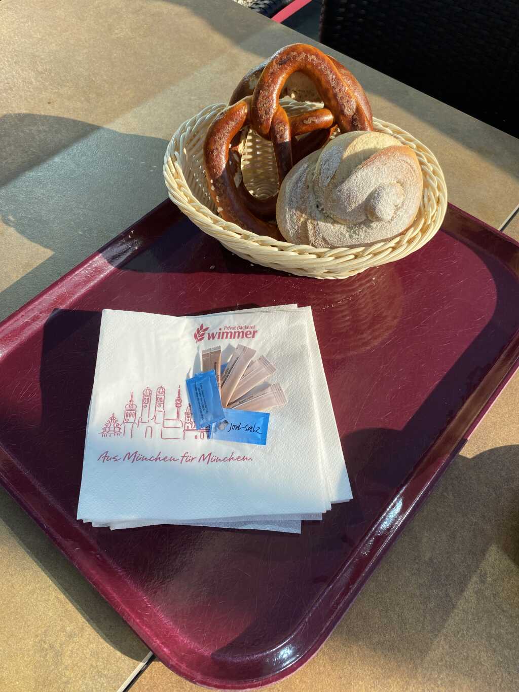 Wir hatten – einen Kaffee mittel für 3,20 € ,der kleine Klassiker für eilige Genießer , eine original Wimmer Handsemmel, eine Wimmer Breze und die Variante Wurst/ Schinken Teller – Wacholderschinken, Pute , Leberkäse und Meerrettich-Frischkäse für 7,20 € und Portion Rührei , drei deutsche Freilandeier mit Handsemmel oder Breze und Butter für 5,70 € Gewählt wurde eine Breze und der Butter abbestellt ( das war auch noch ein Drama, ganz vergessen beim Service) Bezahlt hatten wir 0,15 € weniger, vielleicht wurde der nicht gewollte Butter abgezogen.