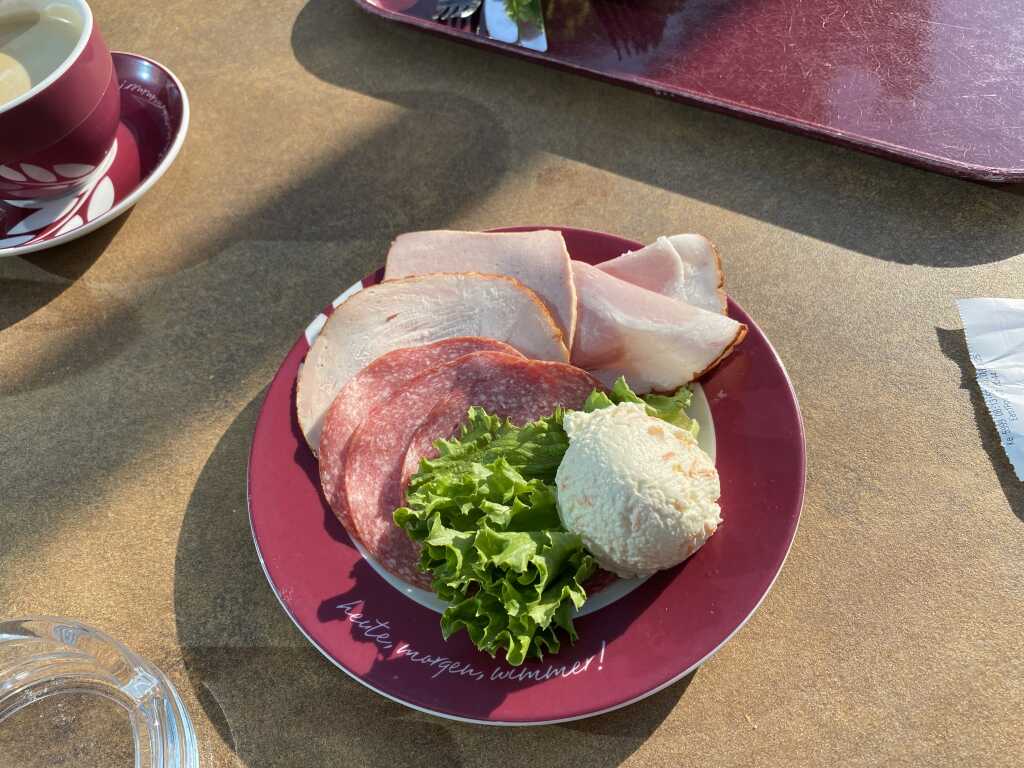 Beim anderen Teller war alles voll belegt, schön wäre noch ein extra Teller um die Semmel aufzuschneiden zum essen. Auf einem Blatt Lollo Biondo gab es eine Nocke von dem Meerrettich Frischkäse. Frischkäse ja, war da, Meerrettich war für uns irgendwie nicht schmeckbar . Was aber irgendwie zart durchkam waren etwas geräucherte Lachsstückchen. Irgendwie fehlte uns hier alles an würze. Salami , ja war da, stand drauf und es gab drei Scheiben davon, das war es auch schon. Mehr an Beschreibung können wir nicht sagen, es nennt sich halt Salami und sieht danach aus. Pute, eine Scheibe etwas trockenes für uns ohne Geschmack lag auf dem Teller. Leberkäse , schon viel davon gegessen, aber die Scheibe hier würden wir nicht danach einstufen als Leberkäse, wir finden keine Beschreibung dafür. Wacholderschinken, die Erwartung war hoch und wir sind tief gefallen. Vor allem war mehr Fett als Schinken vorhanden .