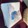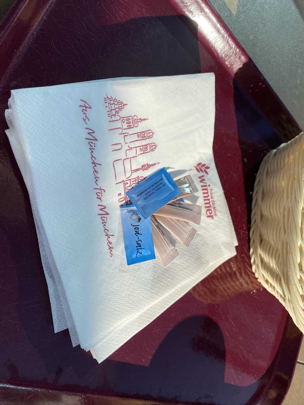 Beim Eingang gibt es einen Ständer wo man sich Zucker, Milch , Servietten, Salz-und Pfeffertütchen nehmen kann. Die Servietten tragen das Logo von der Bäckerei und es wird auf München eingegangen.