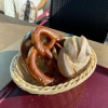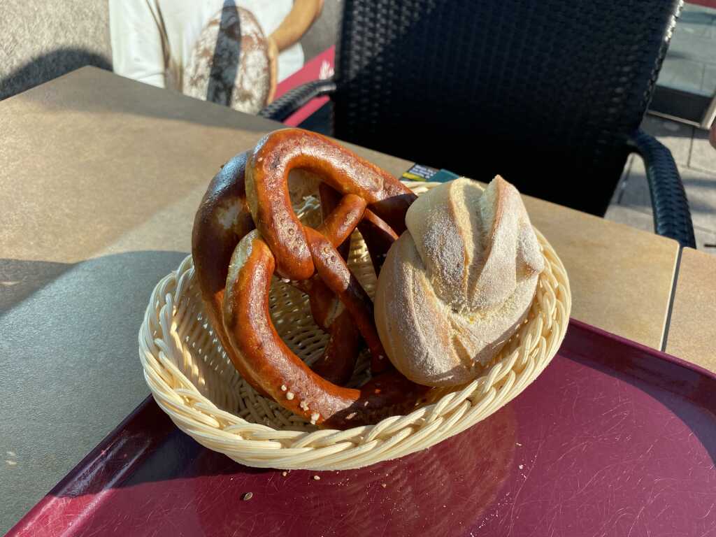 Wir bekamen ein Körbchen mit den zwei Brezen und der Handsemmel. Die Brezen waren jetzt nicht so wie wir sie kennen. Bei uns sind sie außen knusprig, innen weich. Hier waren sie nur weich. An Salz hatte man auch sehr gespart, ja irgendwie auch am Geschmack, das unsere sind sie nicht. Die Semmel war jetzt außen schön rösch und innen weich, die hat uns besser gefallen, auch vom Geschmack her . Was uns immer nicht so ganz gefällt ist ,wenn sie ohne alles in einem Körbchen liegen, da könnte man schon eine Serviette unter legen , denn wir decken dass sie Körbchen nicht ausgewaschen werden.
