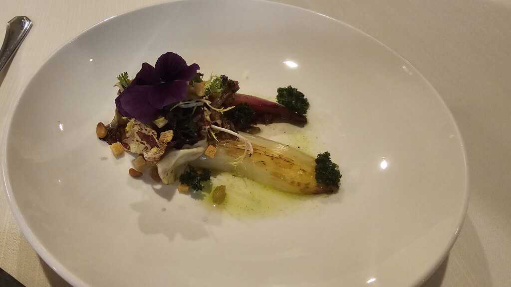 Mein Mann liebt geschmorten Chicorée. Da hoben nur noch die weiteren Komponenten auf dem Teller die Stimmung. Schön angerichtet mit Hornveilchen und ein wenig Crunch.