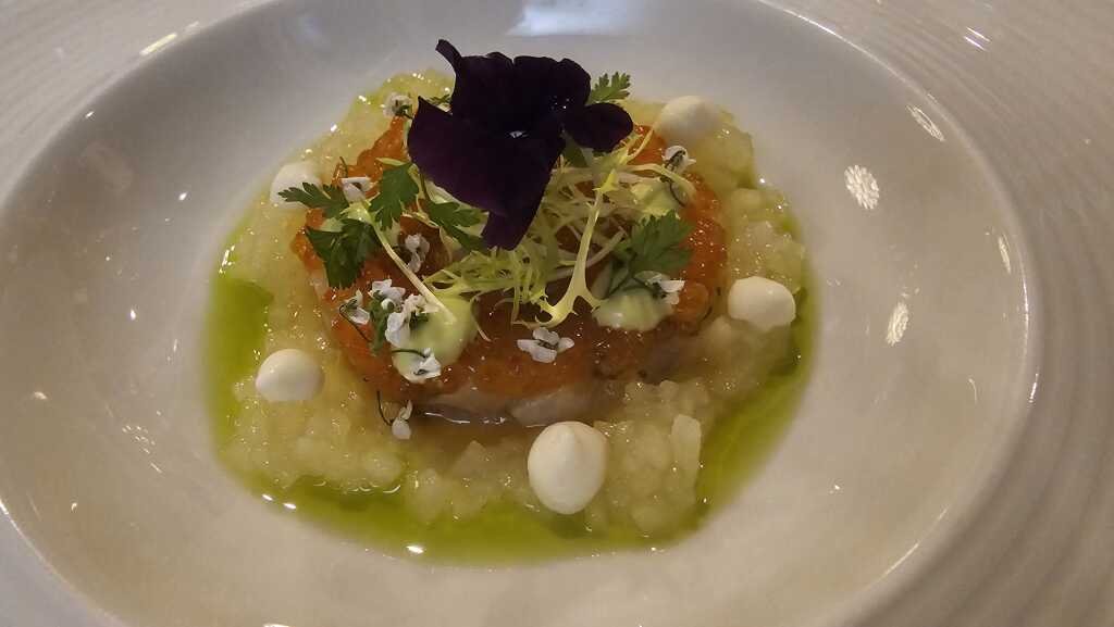 Ein toller, sehr schön angerichteter und perfekt abgestimmter Auftakt! Die Aromen harmonierten sehr gut, ohne das Forellentatar zu überdecken.