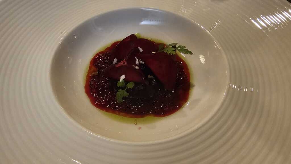 Wir sahen rot! Denn der Frischkäse war liebevoll in hauchdünnen Betescheiben verpackt. Die erdige Bete harmonierte perfekt mit dem Frischkäse. So konnte es weitergehen.
