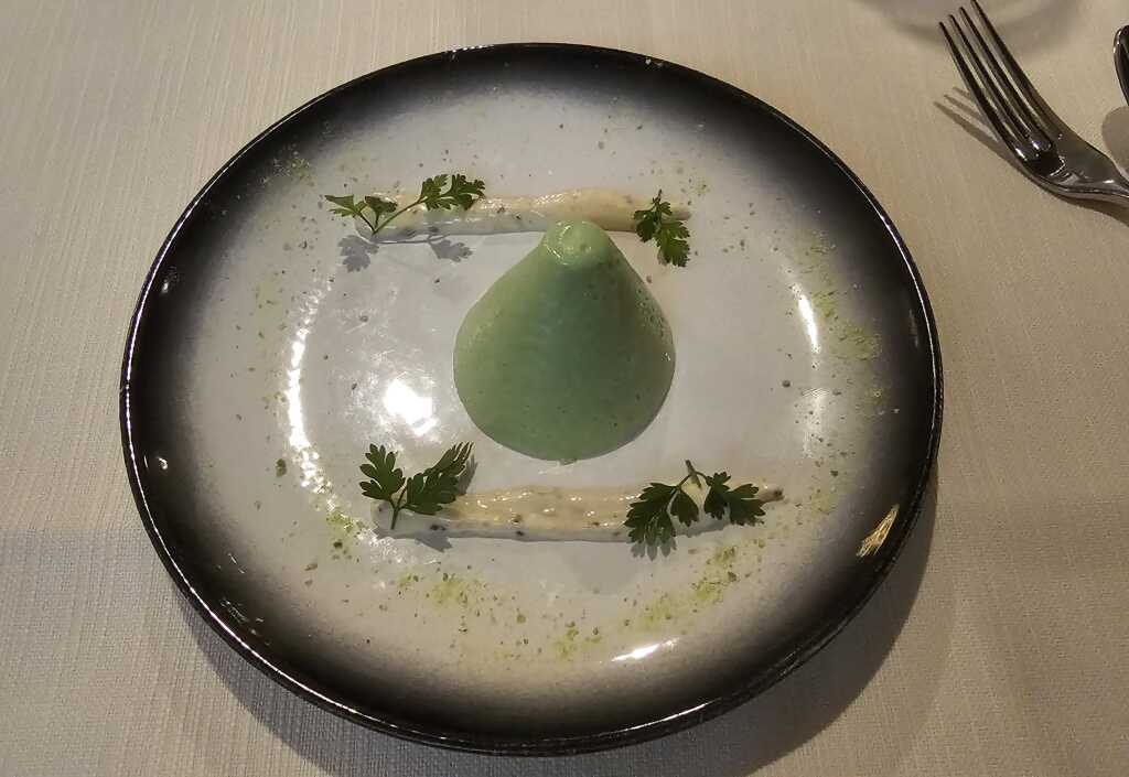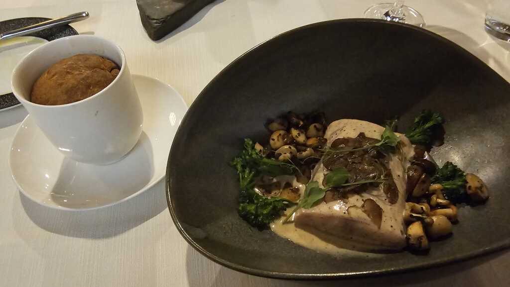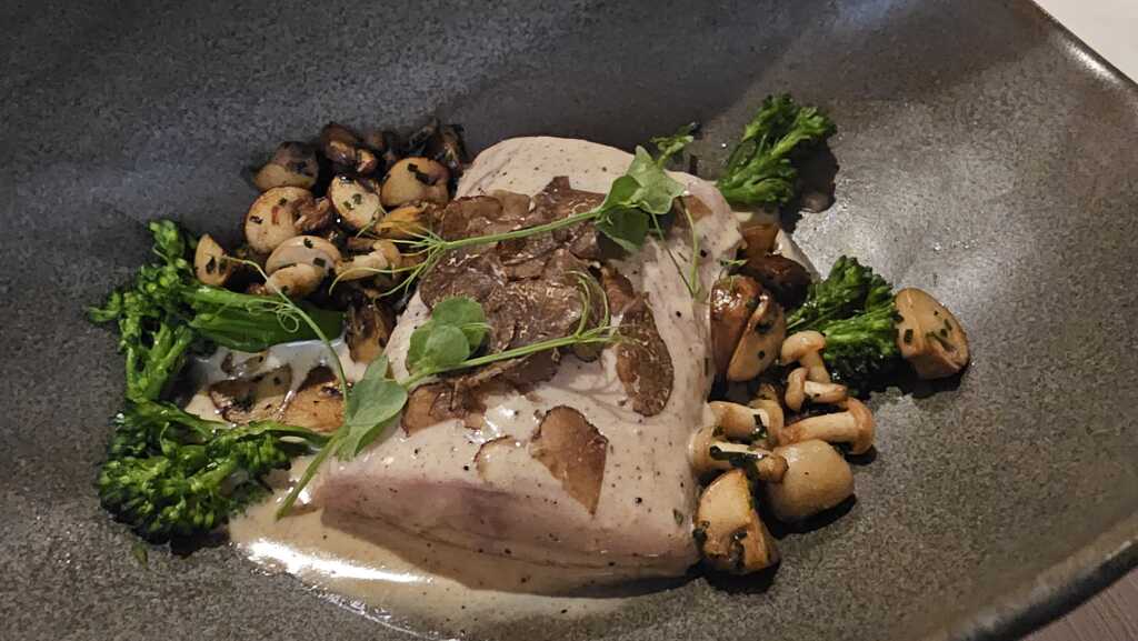 Wels ist einfach ein toller Speisefisch. Beim Pochieren war die Küche wohl etwas zu vorsichtig, er hätte ein wenig länger gegart werden können. Für uns war der Fisch so noch ok, aber teilweise nicht gut zu schneiden. Etwas mehr Gare hätte den Fisch geschmeidiger gemacht. Trotz des kleinen Kritikpunktes ein toller Gang, insbesondere ob des frischen Trüffeltoppings. Der Brokkoli auf den Punkt mit etwas Biss serviert. Die zarten Pilze gaben eine gewisse Cremigkeit dazu.
