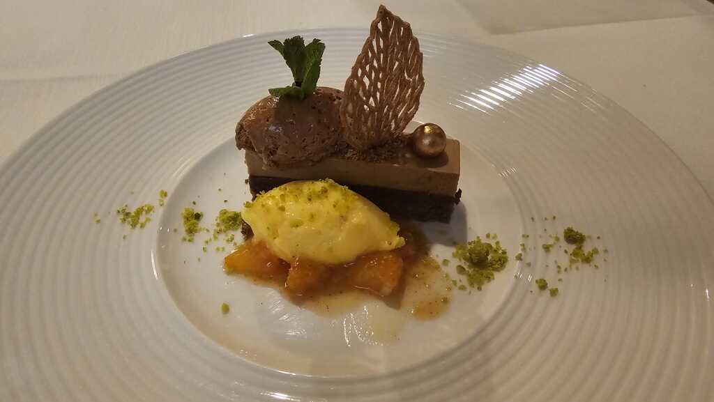 Gâteau von Nougat, Mandarinensorbet & Blutorange