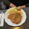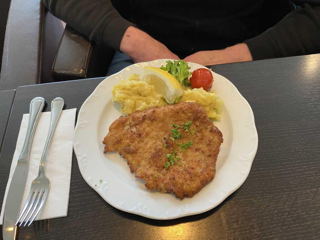 Geschmacklich kennen wir jetzt ein Schnitzel Münchner Art auch etwas anders, wir haben hier im Kopf ( oder auch schon gegessen) dass sich Senf teils auch Meerrettich darin befindet. Hierbei konnten wir nichts schmecken. Es war dezent mit Salz und Pfeffer gewürzt worden. Das hätten wir auch gerne beim Kartoffelsalat gehabt. Der war sehr neutral gehalten, Kartoffeln halt. Sehr fest in der Konsistenz und Säure und würze fehlte uns komplett, genauso wie das schlotzige wie wir es gerne mögen. Einen Schnitz Zitrone gab es noch dazu, der half aber nicht mehr so viel .