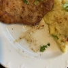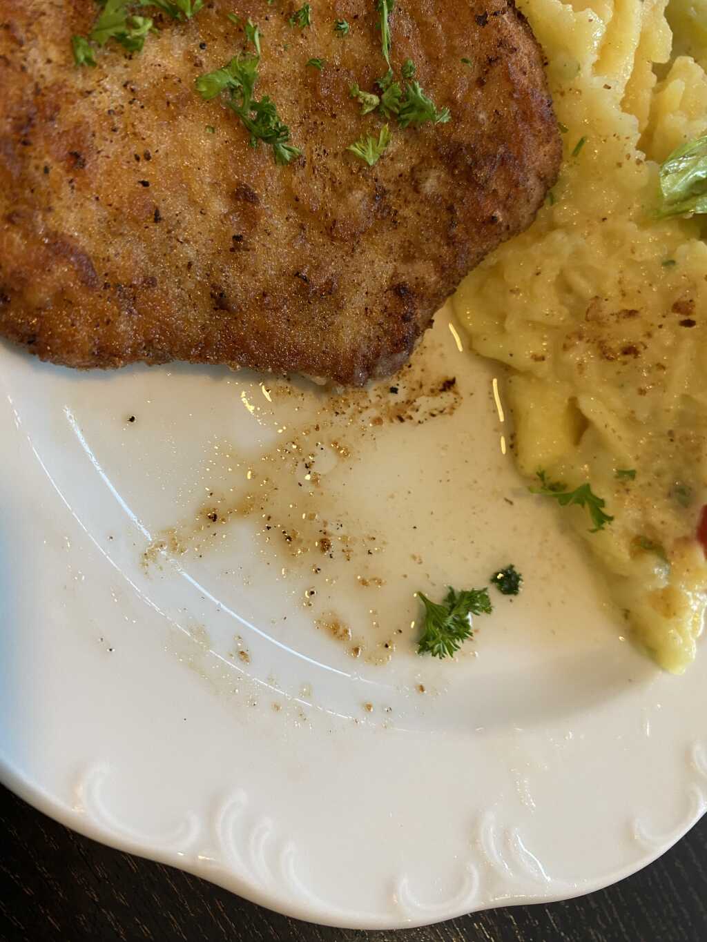 Das Schnitzel hatte eine schöne Größe, und die Panierung war knusprig raus gebraten worden. Allerdings war es sehr fettig, was sich auch auf dem Teller wieder fand. Ist jetzt nicht so unser fall.