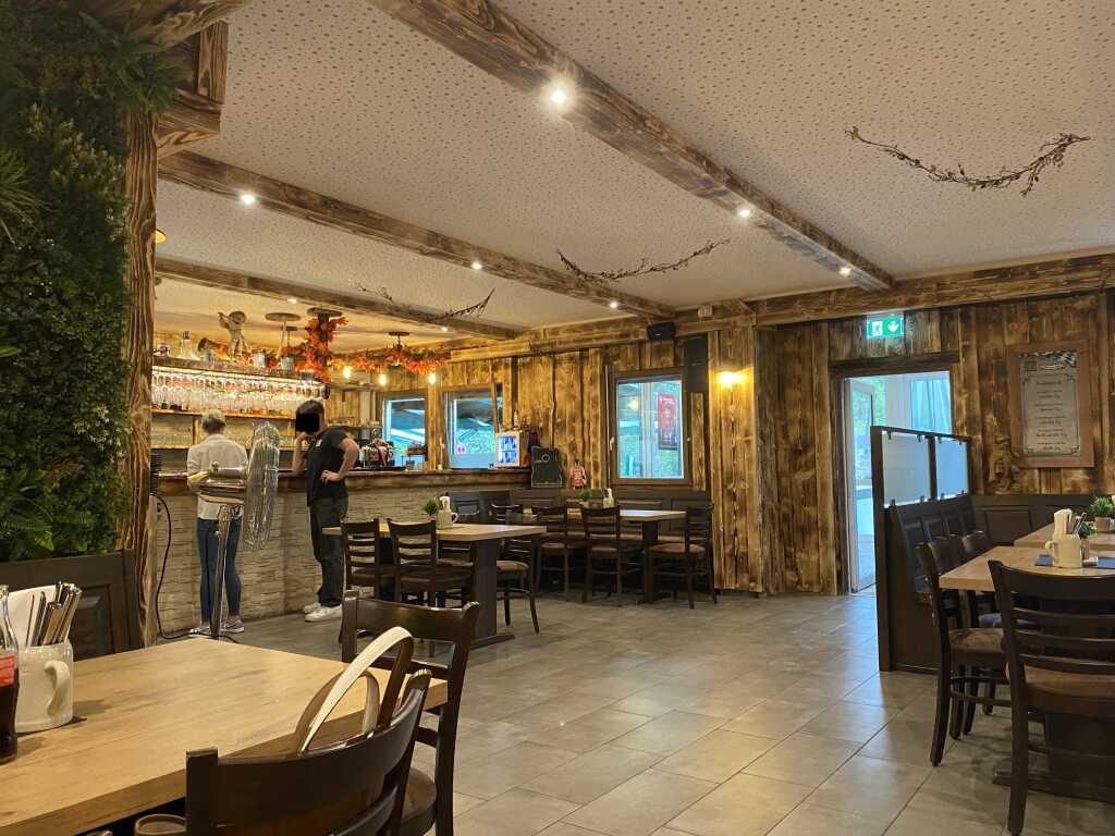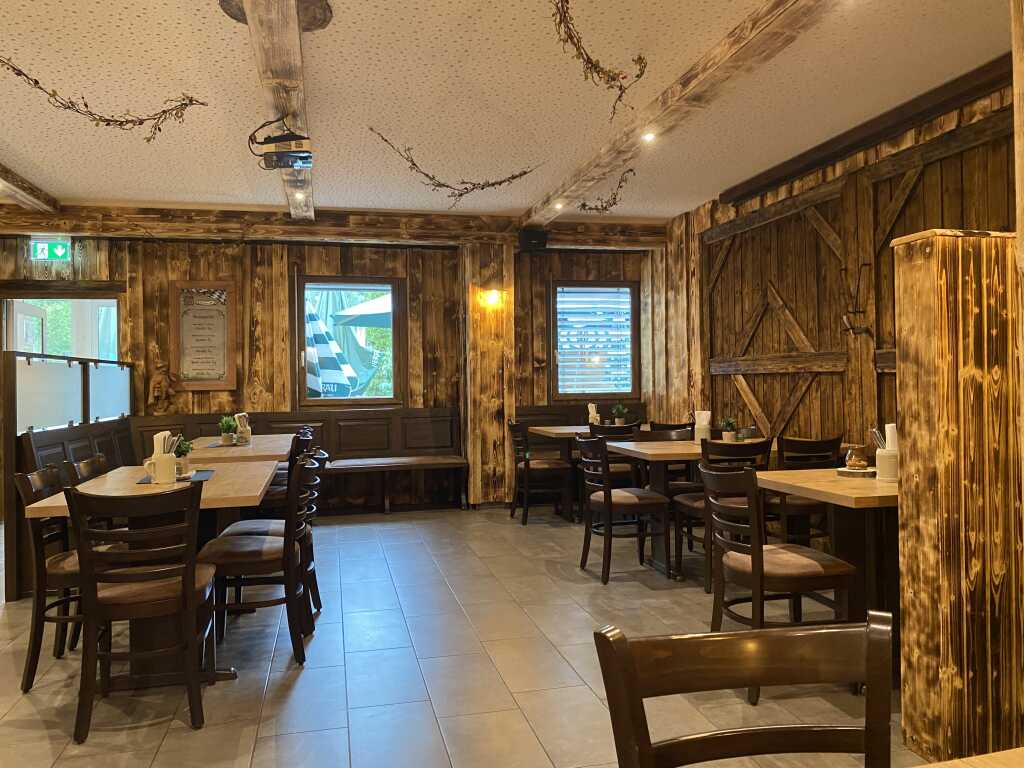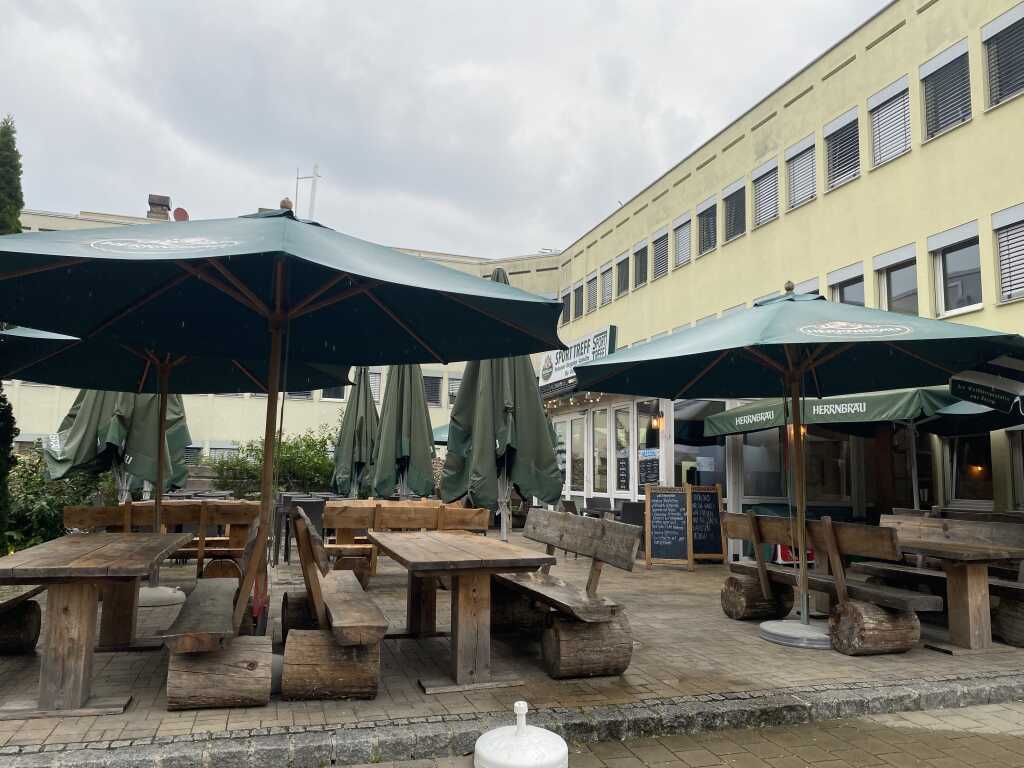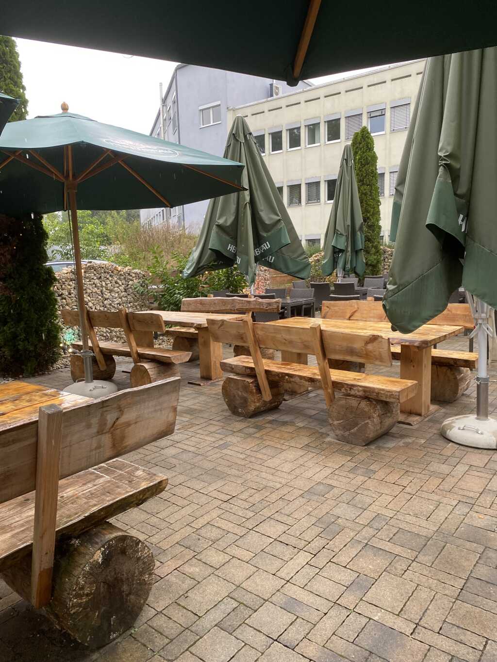 Vorm Haus gibt es einen großen Biergarten mit urigen Holzbänken und Tischen. Es gibt hier auch große Schirme. Leider war heute das Wetter nieselig, somit nichts für draußen.