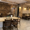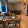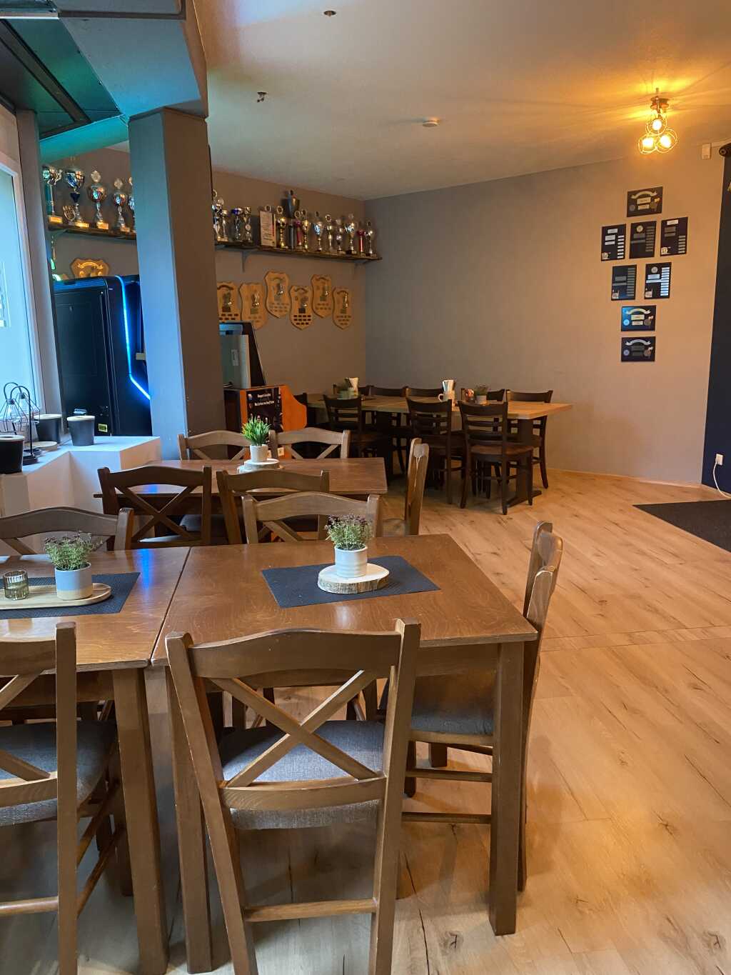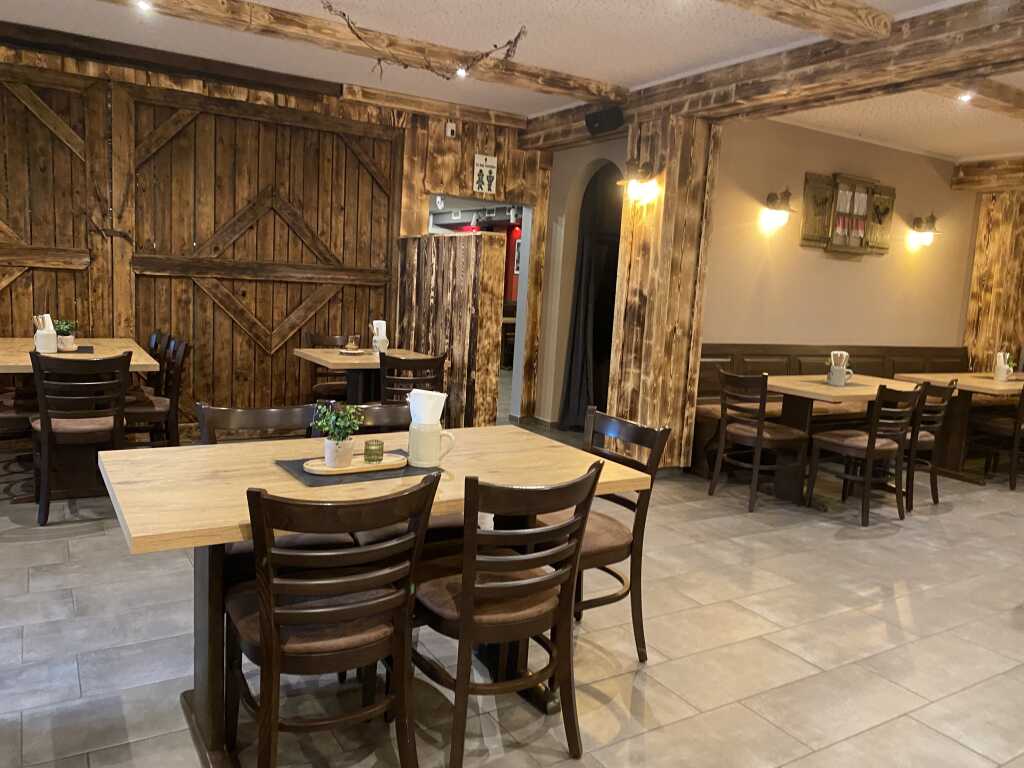Linker Hand gibt es dann irgendwie ein uriges Stüberl, sagen wir mal so. Alles mit Holz verkleidet. Dunkle Stühle und Bänke mit Sitzpolstern und helle Tischplatten .