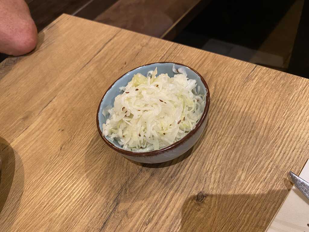 Den Krautsalat gab es in einem extra Schälchen. Es war frisch und mit Kümmel verfeinert worden. Eine schöne Säure kam durch und es schmeckte.