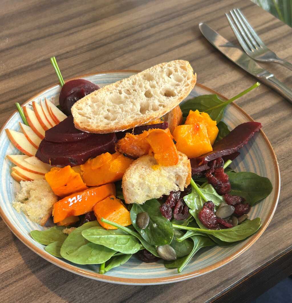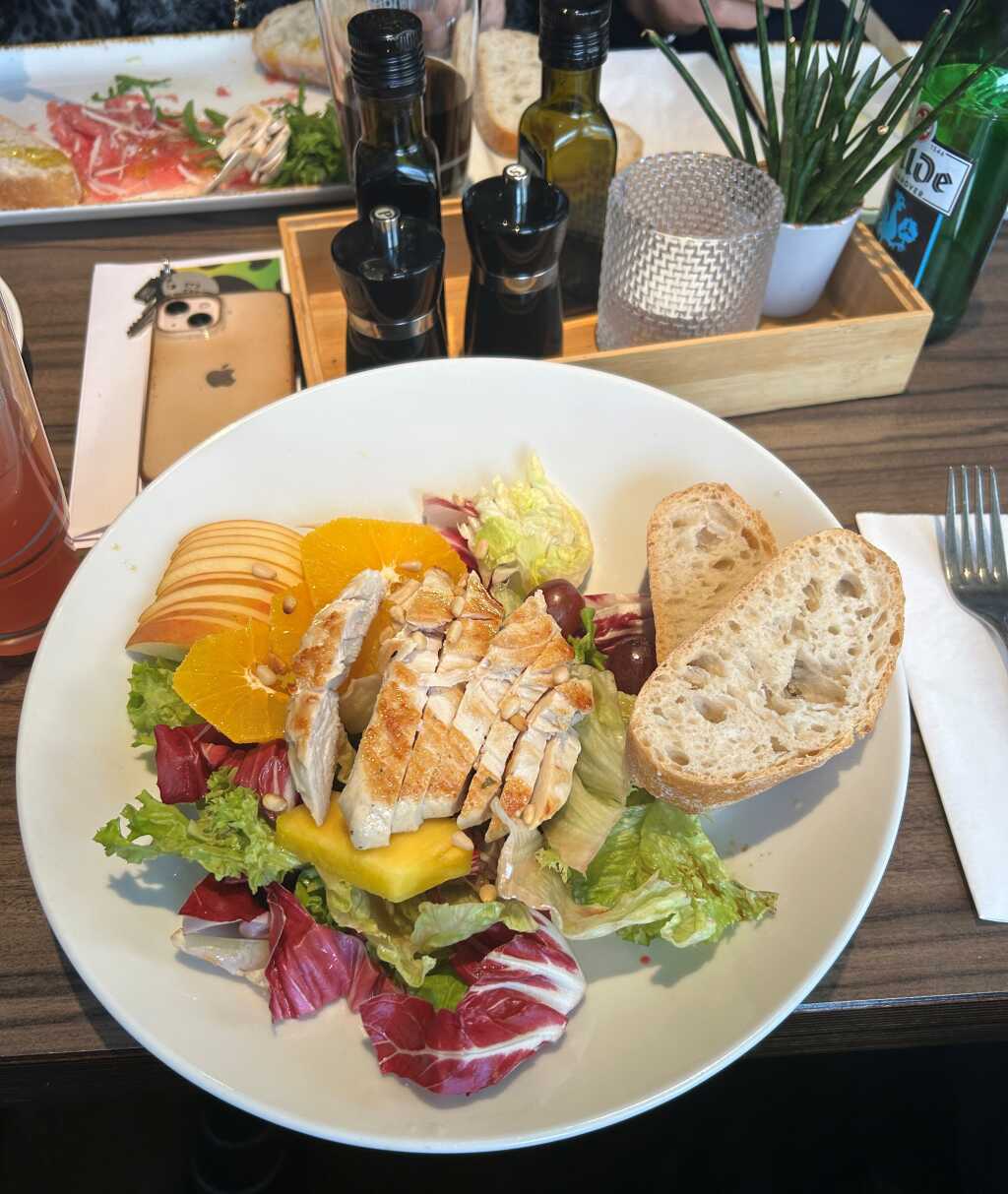 Ende November teilte ich mir mit meiner Gattin einen stattlichen „Italienischen“ (10 Euro). Und auch da war die Zufriedenheit mit dem knackfrischen, mit Schinken, Tomaten, Gurken, Karotten und Käse veredelten Blattgrün sehr hoch. Besonders das würzige Essig-Öl-Dressing sei an dieser Stelle positiv erwähnt, denn es brachte ordentlich viel Schmackes in den bunten Salathügel.
