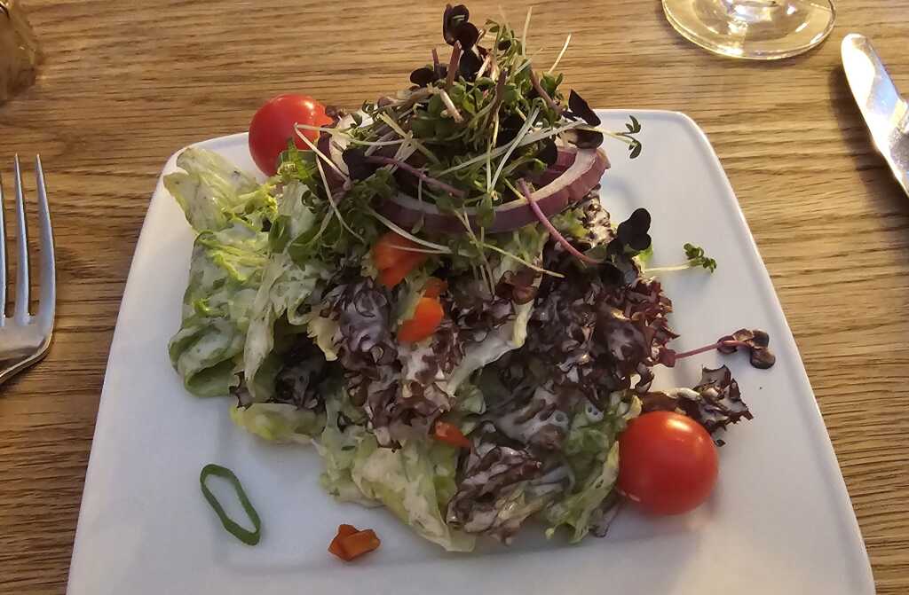 Beide wählten wir „Salat“ als Beilage. Serviert wurde eine kleine Salatgarnitur mit Fertigdressing.