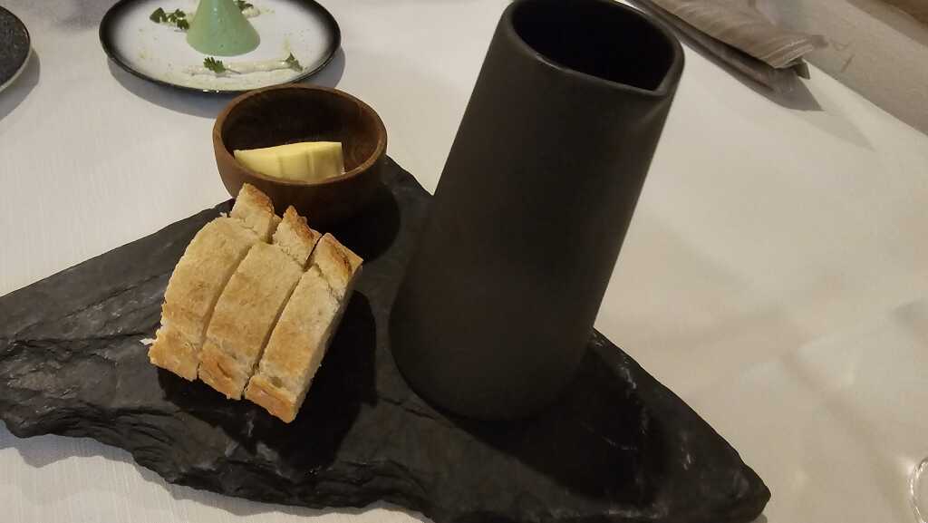 Zu unserem Aperitif, 2 Gläsern Winzersekt brut, grüßte die Küche mit m luftigen Kräuterfrischkäse mit Kerbel. Dazu wurde frisches Baguette, Salzbutter und Olivenöl gereicht.