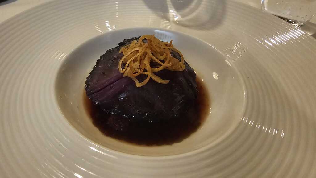Das Bries wurde versteckt unter einer Rotkohlscheibe, garniert mit gerösteten Zwiebeln, serviert.