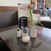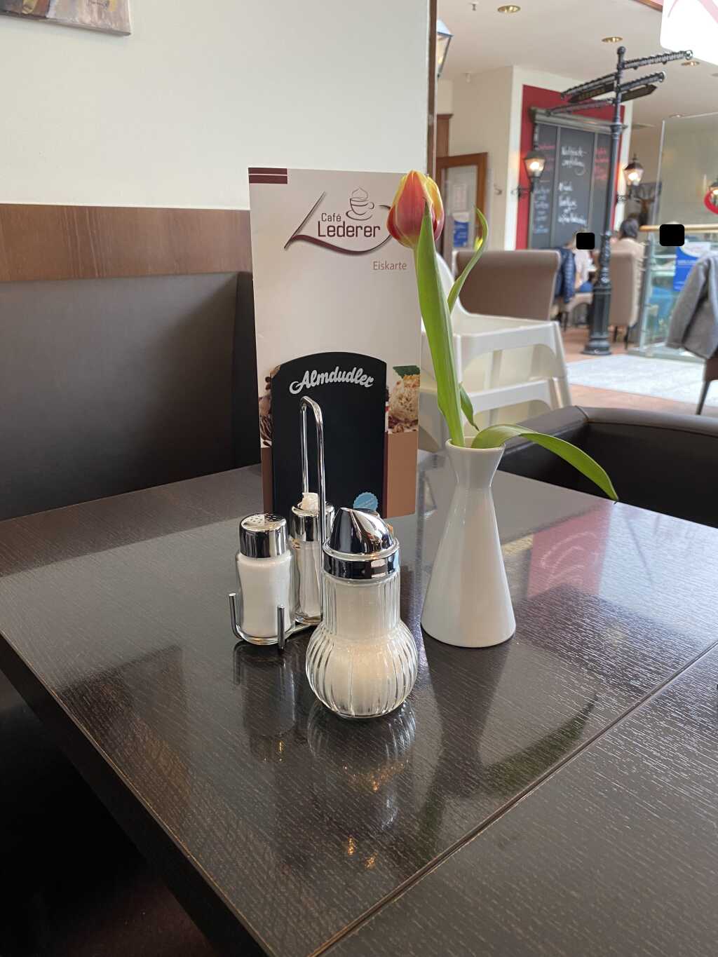 Auf dem Tisch gibt es einen Ständer mit den Speisekarten, einen Ständer mit Salz-und Pfefferstreuern, einen Zuckerstreuer und eine Vase mit frischer Blume.