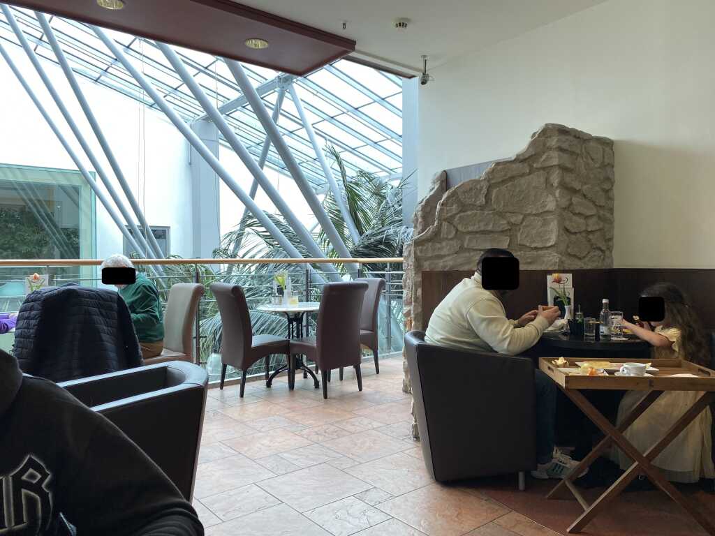 Es gibt hier verschiedene Bereiche. Es ist alles unterschiedlich eingerichtet. Im Erdgeschoss gibt es Kaffee und Kuchen, im ersten Stock auch das Restaurant. Wir waren auf der Seite unter dem Glasdach. Hier gibt es Art Lederstühle mit hohen und niedrigen Lehnen in schwarz. Es gibt hier unterschiedliche Tischgrößen, mal rund, mal eckig.