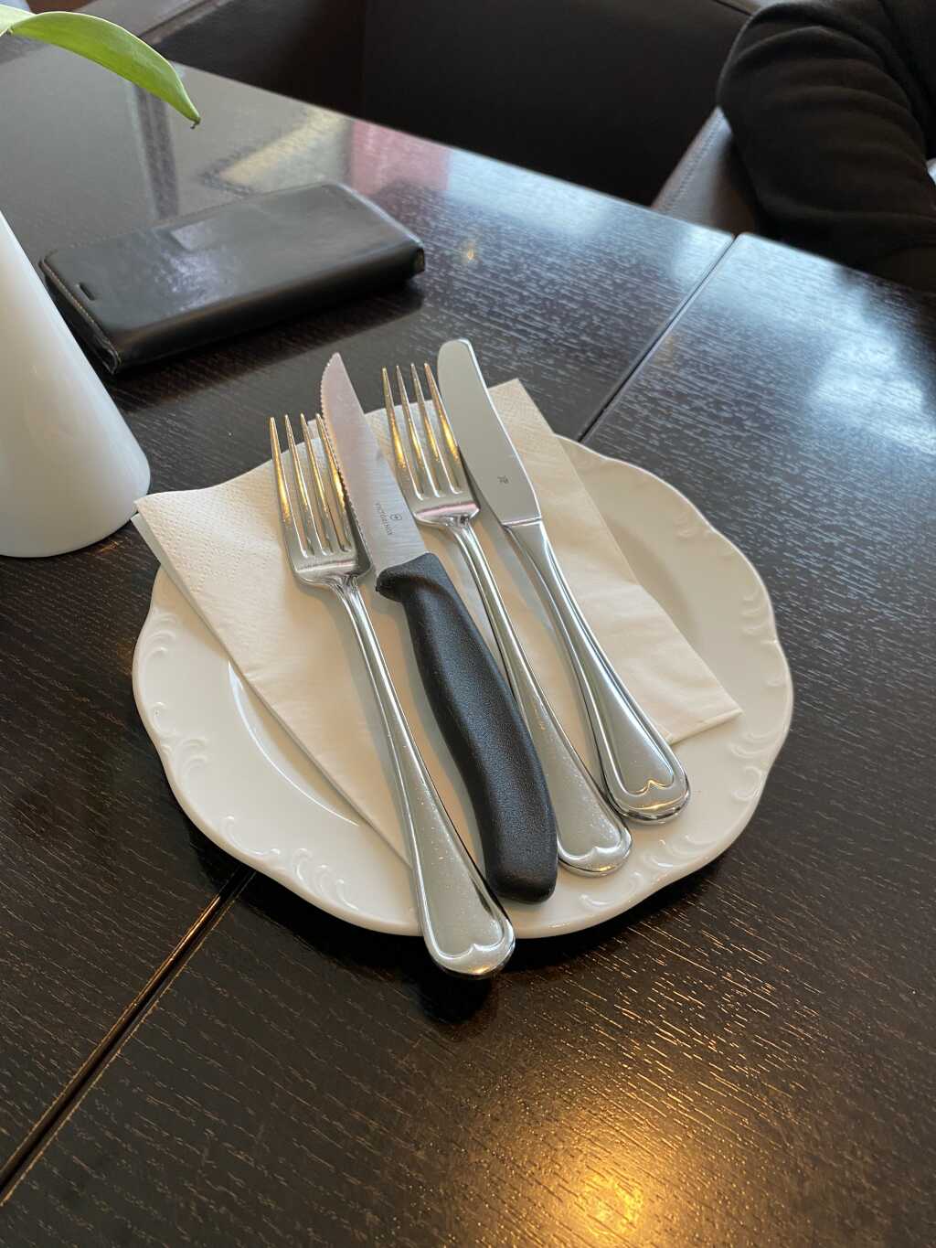 Wir sahen einen leeren Tisch ohne Reservierungsschild und nahmen Platz. Die Karte befindet sich bereits auf dem Tisch und so konnten wir schon einen Blick rein werfen bis dann mal eine Dame zu uns kam. Es war Fasching und der Service Maschkara bekleidet. Sie begrüßte uns freundlich und fragte was wir trinken möchten. Die Getränke kamen rasch mit einem bitte schön und sie meinte ob wir auch was essen möchten . Kurz darauf brachte sie einen Teller mit Besteck und Servietten und stellte ihn mit einem so, bitte schön an den Tisch. Es gab unterschiedliche Messer und wir teilten sie auf wie wir dachten. War aber falsch. Bei der Essenslieferung meinte sie – des Bsteck miasts dauschen. Des Sägemesser braucht ma für´n Camembert- Die Vorfreude darauf stieg in mir auf .