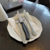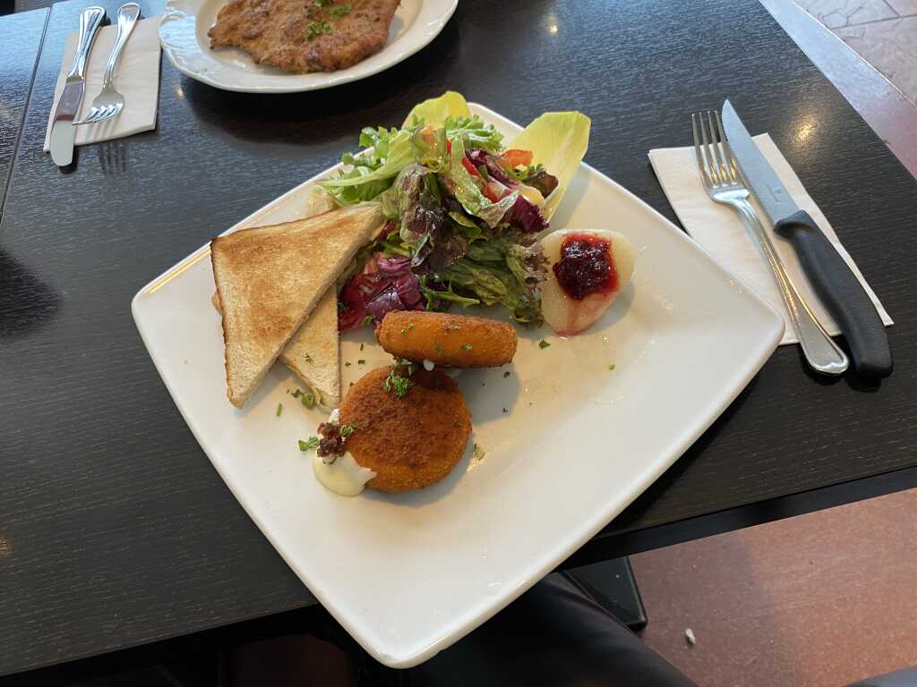 Beim Camembert hatte ich ja schon Kopfkino wie sie sagte das ich das Sägemesser bräuchte. Warum weiß ich nicht, man hätte ihn auch mit dem normalen Messer schneiden können. Es ist halt ein Fertigprodukt, aber das denke ich mir schon immer vor der Bestellung, sehr selten dass es selbstgemachten gibt. Mag ihn halt ab und zu gerne mal. Dieser war ein gutes Produkt, schön raus gebacken, nicht zu fettig. Er zerlief schön beim anschneiden, passte. Die Preiselbeeren gab es in einer eingelegten Birne. Die bräuchte ich nicht, in einem Schälchen wären sie mir lieber und ein wenig mehr davon für die zwei Stück Camembert. Standart Glasprodukt sagen wir mal. Bei der Salatgarnitur gab es etwas gemischte Blattsalate, Tomatenachtel , Gurkenscheiben und Paprikastreifen. Das Dressing war ein einfaches Essig-Öl-Dressing das vermutlich mit etwas Senf verfeinert wurde. Vom Säure Verhältnis war es ausgewogen und auch schön abgeschmeckt worden. Dazu gab es eine Scheibe Toastbrot die halbiert wurde und getoastet.