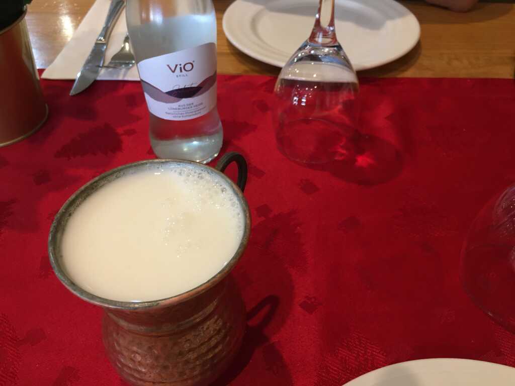 Hauptspeise: Gebratenes Petersfischfilet gebettet uf einem Duett von cremigem Pastinaken-, Sellerie- und Erbsenpürree an Dill-Weißweinsauce, serviert mit pochiertem Ei oder Filet Wellington vom argentinischen Weiderind mit Kartoffelstampf , Rosenkohl-Karottengemüse und knusprigen Baconstreifen, dazu eine gehaltvolle Rotweinjus. Mutter, Tochter und ich hatten das Filet Wellington gewählt; nur der Schwiegersohn tanzte mit seinem Peterfisch aus der Reihe und gab davon auch noch über die Hälfte an seine Frau. Hingerissen geht anders, aber ihr hat der Fisch vorzüglich geschmeckt, Vorzüglich war auch das Filet Wellington mit seine Beilagen. Eine winzige Kritik kann ich mir allerdings nicht verkneifen: Die besten Zeiten von argentinischem Rindfleisch (ich habe es selbst in den Achtzigern bei Arbeitsaufenthalten vor Ort oft genug verkosten dürfen) sind lange vorbei, ich verstehe nicht, dass es um den halben Erdball zun uns herangekarrt wird, um in Restaurantküchen verarbeitet zu werden. Gibt es doch direkt vor unserer Haustür bestes Fleisch von Rindern der Rassen Charolais, Limousin bzw. Blonde d´Aquitaine, die allesamt dem argentinischen Import geschmacklich die Rücklichter zeigen.