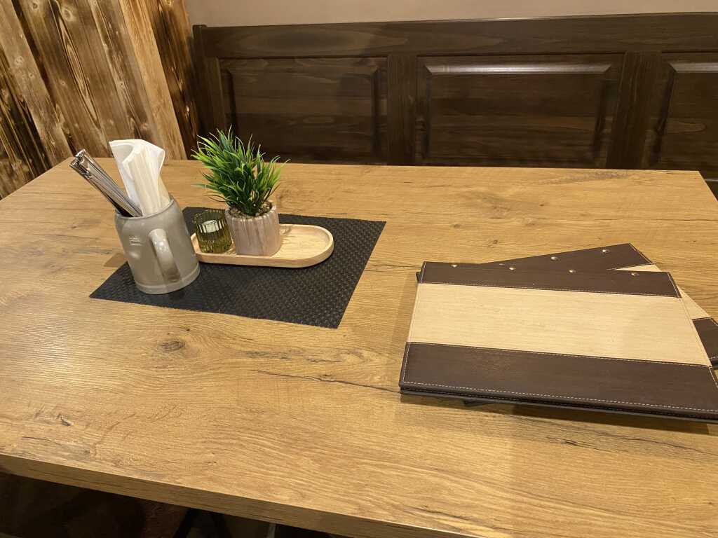 Es gibt hier Karten mit braun/beigen Einband und festeren Kunstoffhüllen wo sich die schön aufgemachten Zettel befinden. ( Foto davon will GG ja nicht mehr) . Es gibt Suppen, Salate, Schnitzelgerichte, Burger, Steaks / Grillteller, vegetarisch, Nachspeisen, Brotzeiten und was für die kleinen. Schön finden wir hier dass man unter verschiedenen Beilagen auswählen kann . An verschiedenen Tagen gibt es spezielle Angebote. Die Karte befindet sich auch auf der HP.