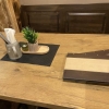 Auf dem Tisch gab es ein Deckchen, einen Krug mit Besteck und festeren Servietten in weiß, ein Art Tablett auf dem sich ein künstliches Blümelchen befand und ein Glas mit Teelicht.