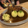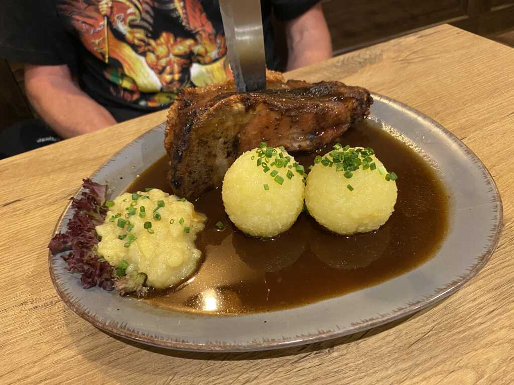 Die Soße schön dunkel, richtig gut eingekocht. Ein klasse Bratengeschmack war vorhanden und sie war würzig abgeschmeckt mit einer feinen Kümmelnote. Dazu gab es zwei Kartoffelknödel mit festerer Konsistenz, mögen wir so. Gefüllt waren sie mit Brotkern und mit etwas Schnittlauchröllchen bestreut worden. Kartoffelgeschmack war einwandfrei vorhanden und an Salz fehlte es ihnen auch an nichts. Der Kartoffelsalat in der Soße war für uns ein wenig ein Rätsel. Kennen wir so nicht, stand auch nicht dabei. Ist ja egal, geschmeckt hat er , er war schön schlotzig und einwandfrei gewürzt worden mit einer schönen Säurenote. Es war ja Spotzls Gericht, der hat nichts dagegen wenn Kartoffelsalat in der Soße liegt, also passte es . Mein Fall ist es nicht, mag keinen Salat in der Soße.