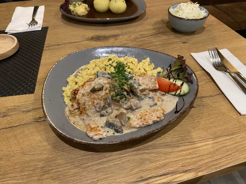 Beim anderen Teller gab es als Deko ein Blättchen Lollo Rosso, eine Scheibe Gurke und ein Achtel Tomate. Und das Balsamico Geschreibsel, das hält sich immer noch und ist für uns immer noch vollkommen unnütz auf dem Teller. Wenigstens war es nur auf der Deko. Bestreut wurde das Gericht noch mit etwas Schnittlauchröllchen. Es gab ordentlich Fleisch auf dem Teller, schön angebraten und sehr zart ,saftig und schön gewürzt worden. Die Champignons waren nicht zu klein geschnitten, frisch und wir denken etwas angebraten. Der Rahm dazu schön cremig, von der Konsistenz nicht zu dick oder zu dünn, passte für uns. Ein sehr schöner Geschmack befand sich in der Soße, passte. Die Spätzle ( viele sind der Meinung das sind Knöpfle, bei uns sind es Spätzle) hatten eine schöne Butternote , vermutlich in dieser nochmal in der Pfanne warm gemacht. Konsistenz passte und an Salz fehlte uns auch nichts.