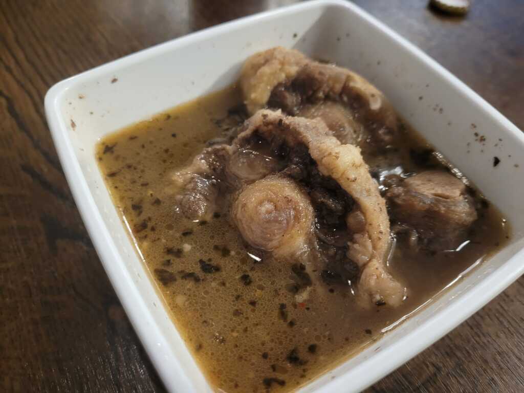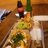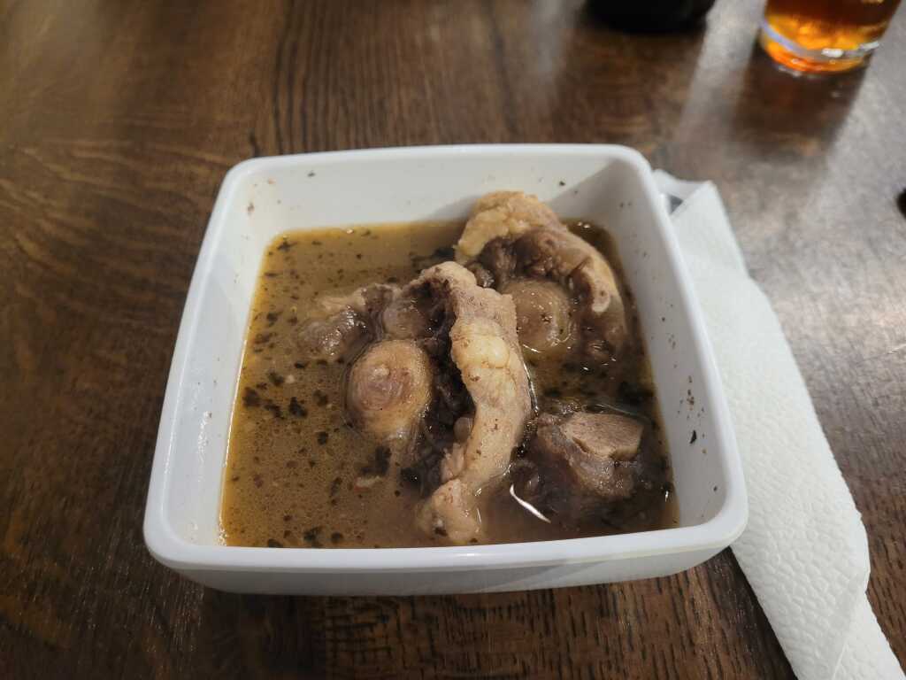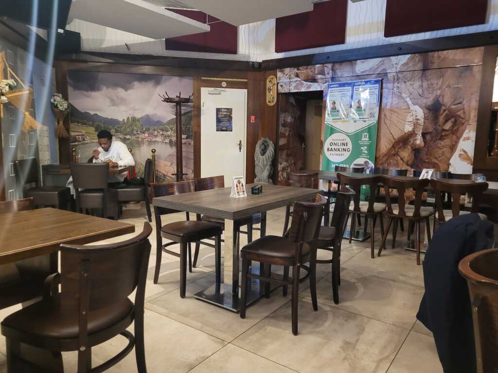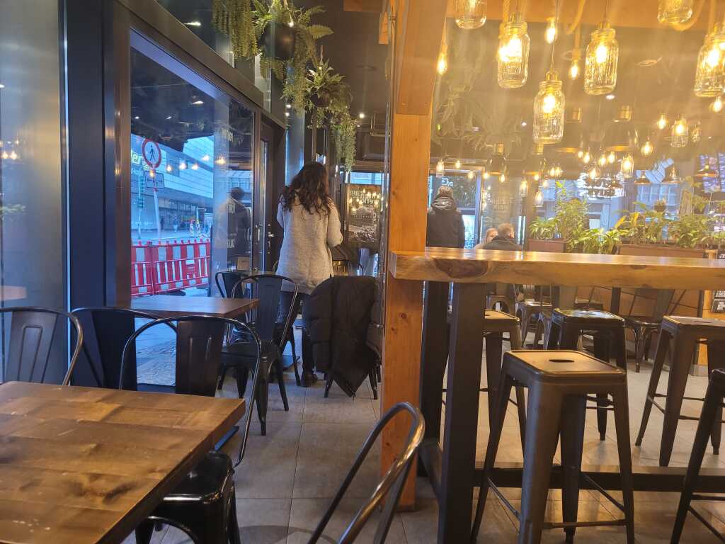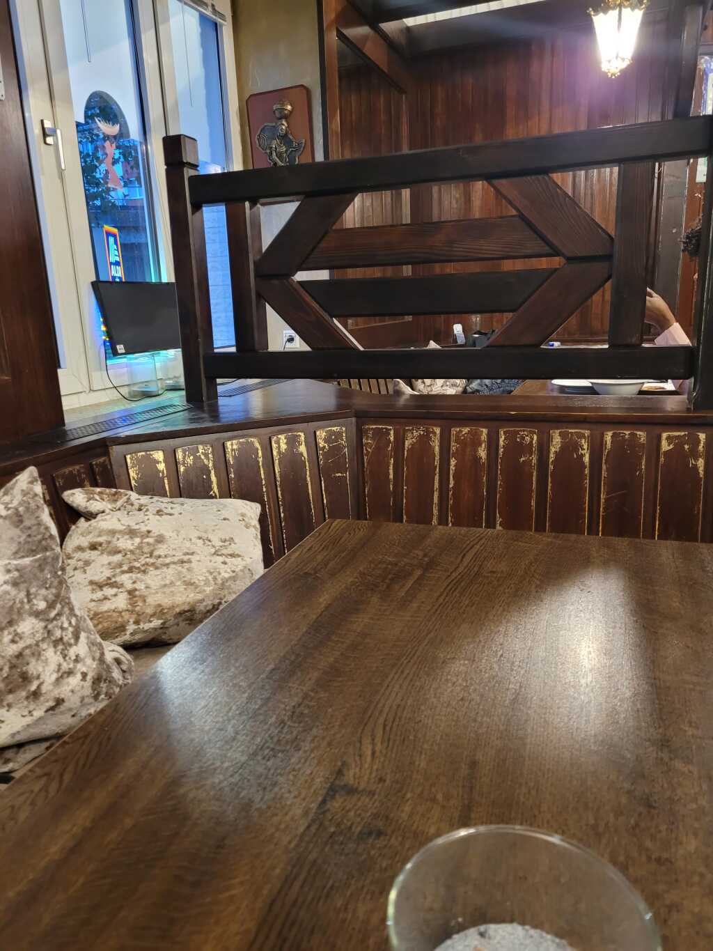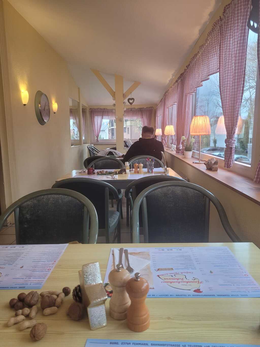 Dies ist zwar ein langer Schlauch, aber hier hat man einen guten Blick nach draußen. Die Stühle waren gut gepolstert, die Tische ausreichend groß. Nicht unbedingt hübsch, aber praktisch pragmatisch. Salz-und Pfeffermühle standen auf den Tischen, ein kleiner Stern und paar Nüsse sollten als weihnachtliche Dekoration herhalten. Die Gästezahl war auch sehr überschaubar, Anfangs saßen wir mit einem weiteren Pärchen allein da drin, später gesellte sich noch eine Familie mit zwei lärmenden Kindern hinzu.