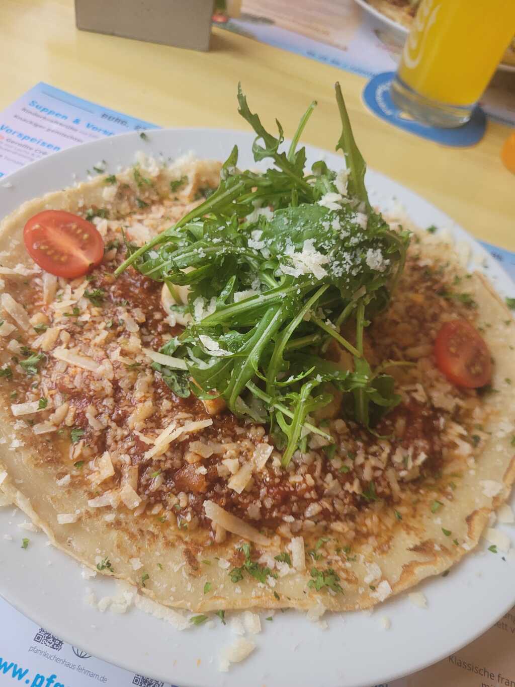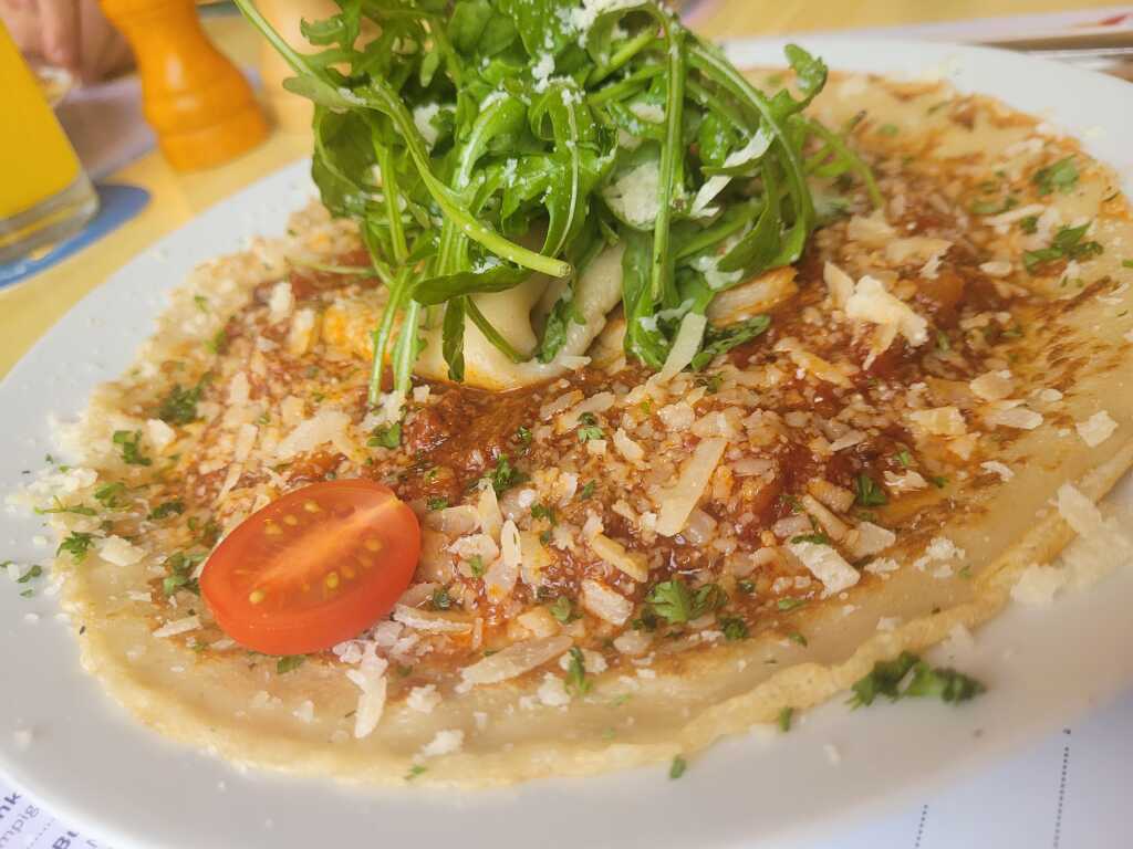 · 1x Mama Mia – Pfannkuchen mit hausgemachter Rinderbolognese, Parmesanhobel und Rucola für 19,60 €