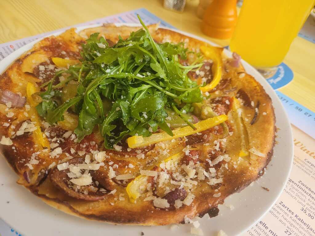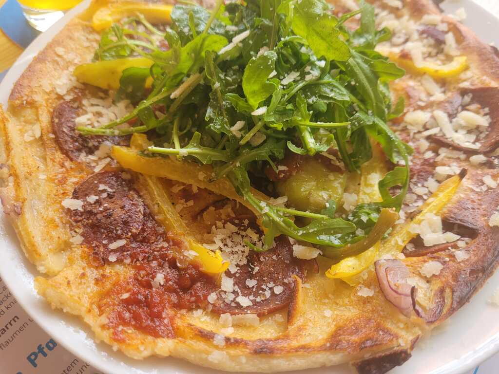 · 1x Sucuk Pfannkuchen – die Gästewahl 2024 – Pfannkuchen mit Sucuk(Rindersalami mit Knoblauch), Paprika, Tomate, Zwiebeln, Parmesan und Jalapeños für 20,40 €
