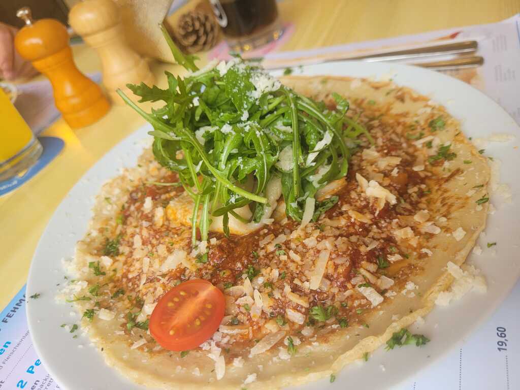 Der Pfannkuchen gut gemacht, nicht zu dick, nicht zu dünn. Darauf dann Bolognese. Eine würzige, leicht scharfe Bolognese mit fein krümeligen Hackfleisch vom Rind, aber fast zu viel Tomatensoße dazu.
