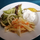 Blattsalat, fein marinierter Krautsalat mit Karotte, Zaziki und Peperoni. Das Essig-Öl-Dressing leicht und gut abgeschmeckt. Leider konnte ich hier kein gutes Olivenöl erkennen, ich vermute einfaches Speiseöl am Dressing.