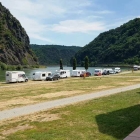 Ich suchte dann schon mal einen schattigen Platz zur Rheinseite auf der beschatteten und gepflegten Terrasse. Zwischen Rhein und Hotel liegt am Rheinufer ein Campingplatz.