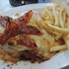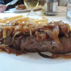 Nach absolut passender Wartezeit wurde uns vorab schon einmal der kleine Salatteller serviert. Mit einfachem Essig-Öl-Dressing und den üblichen Krautereien wirkte er zwar wie ein kulinarischer Anachronismus, war aber schmackhaft angemacht und vertrieb die ersten Hungergefühle. Recht zeitnah wurden dann auch die Hauptgerichte aufgetragen. Die Rumpsteaks waren von stattlichem Cut (geschätzte 220 bis 240 Gramm), lagen unter einer üppigen Röst-Zwiebel-Haube und stammten laut Bedienung aus Argentinien. Die Pommes waren normale TK-Ware, wie man sie von der gutbürgerlichen Küche her kennt, aber nicht totfrittiert und zudem perfekt gesalzen. Der Balkanteller zu meiner Rechten war keine übertrieben große Portion. Die leider etwas zu trocken geratenen kroatischen Grillverdächtigen (Raznjici, Cevapcici und Co.) waren mit einer ordentlichen Portion Djuvec-Reis unterfüttert. Die Zwiebeln und das Ajvar lagen separat daneben und lieferten im Bedarfsfall die entsprechende Würze.