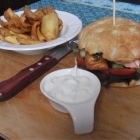 Der Burger war klassisch geschichtet und frisch zubereitet. Das Lachsfleisch war am Stück gebraten und nicht als Patty geformt worden. Es war mit etwas zu viel Hitze gearbeitet worden; denn an den Rändern trat schon Eiweiß aus. Aber saftig war das Stück schon noch.