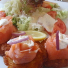 Der Rächerlachs war angenehm zubereitet und entsprach den Erwartungen. Die Reibekuchen waren kross ausgebacken. Der Salat war frisch zubereitet: Tomate, Rucola, Lollo und eine weißes Dressing.