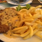 Etwas preiswerter, nämlich 10,90 € (grins), war meine Mahlzeit. Pfefferrahmschnitzel Madagaskar mit Pommes. Eine große Portion, für die man vielleicht besser einen etwas größeren Teller hätte nehmen sollen. Auch hier zwei Schnitzel von ausgezeichneter Qualität mit schöner welliger Panade. Die Madagaskar-Sauce in guter Konsistenz von angenehmer Schärfe. Da blieb kein grünes Pfefferkörnchen mehr übrig. Die Pommes schön bissfest, gut gewürzt, vielleicht ein bisschen blass, aber auch in Ordnung. So liebe ich es. Es hätte sogar etwas mehr Sauce sein dürfen. Ich musste gleich mal an den Kollegen Daueresser denken, der ja auch ein Fan von Sauce auf paniertem Schnitzel ist.