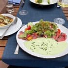 Ein Klassiker dort in der Weinstube. Im Nachhinein vielleicht etwas unglücklich die Wahl, zweimal kalt aufgeschnittenes (Rind-)Fleisch mit Sauce, aber jeder das was ihr gefällt ;.) Der Salat diesmal etwas besser, das Fleisch auf dem Bild spricht für sich. Die grüne Sauce war über jeden Zweifel erhaben und die Bratkartoffeln durften sich zu Recht als solche bezeichnen. Schön mit Speck und Zwiebeln, mir gegenüber war jemand zufrieden. 4*