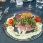 Mir hatte auf der Karte gebratenes Filet vom Saibling mit Pasta als Hauptgericht am besten gefallen. Auch hier eine schmackhaft abgeschmeckte Buttersauce als Grundlage für Fisch und Pasta, das Filet einwandfrei gebraten, knusprige Haut, glasiges Inneres. Geht nicht besser und sorgte auch für großen Genuss. Für uns Beide gehörte zu den Hauptgerichten ein Salat dazu.