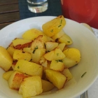 Sah echt geil aus! War aber ein ziemlicher Klotz, als ich das Gericht zu Gesicht bekam. Ich befürchtete schon leicht ironische Kommentare der Tischgenossen ob meiner Maßlosigkeit, aber das änderte sich mit dem Riechen und Schmecken dieser Sünde! Die Karte nannte es Schafskäseküchlein mit Tomaten. In Wahrheit war das aber ein sündhaft gutes Soufflé mit Schafskäse und Tomaten drin! Großartig und so gut, dass ich viel neidische Blicke am Tisch bemerkte.