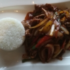 Das Rindfleisch war ebenfalls lecker auf einem Teller angerichtet, auf den Ersten Blick dachte man erstmal, es ist zu wenig Soße, was sich aber nicht so bestätigte. Das Fleisch und das Gemüse schon schön scharf gebraten, fast schon gegrillt, von guter Konsistenz, saftig, nicht zäh. Über dem ganzen Gericht lag eine angenehme Schärfe, die ein Nachwürzen nicht erforderlich machte (was ich ja sonst immer tue). Es stand auf den Tischen auch nichts zum Nachwürzen, das zeugt auch von einer gewissen Überzeugung, dass die Gerichte gut abgeschmeckt sind. Etwas hat mich beim Essen zunächst irritiert, irgendwie war etwas anders bzw. dachte ich, dass vielleicht etwas fehlt.