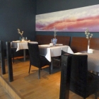 Das Ambiente ist schlicht, aber stilvoll-elegant. Auf den schwarzen hellgepolsterten Stühlen mit oder ohne Hussen kann man bequem sitzen, die Tische sind sehr schön eingedeckt, insgesamt Wohlfühlatmosphäre.