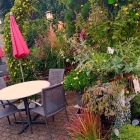 Der Hirsch gehört zu den Lokalen, die es sich leisten können, Montag, Dienstag und Mittwoch als Ruhetage auszurufen. Welch Glück, dass wir an einem Freitagabend eintreffen und auch schon reserviert haben (das empfiehlt sich hier immer). Von der Rückseite kommend, bestaunen wir erst mal den Kräutergarten, in dem es sich wundervoll bei gutem Wetter draussen sitzen lässt. Eigentlich ist es ein schlichter, großer, mit Asphaltsteinen ausgelegter Hof, den jedoch einige Menschen mit bemerkenswert grünem Daumen in eine wahre innerstädtische Oase verwandelt haben. Zu gerne hätten wir hier diniert, doch bei sinkenden abendlichen Temperaturen erschien uns das doch zu gewagt. Im Sommer ist es aber sicherlich eine einzigartige Erfahrung! Laut Homepage stehen hier 25 Plätze unterm Dach, 25 Plätze unter Markisen und 30 Plätze im Freien zur Verfügung.