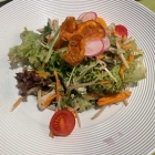 Das würzig rezente Ragout vom Maibock (34,90 Euro) dümpelt in einer kräftigen Wildsauce mit frischen Pfifferlingen (großartig!) und wird von buntem Gemüse (zarte Kohlrabi, bissfeste Möhre, Blumenkohl und Broccoli), Preiselbeeren und Spätzle begleitet, die augenscheinlich so was von handgeschabt sein müssen: mal behäbig dick wie ein kleiner Finger, mal auslaufend fein und zart. Allerdings ein bisschen blass. Alles in allem ein Gedicht. Der dazu bestellte Beilagensalat (8,90 Euro) wäre eigentlich überflüssig gewesen, doch er glänzt durch knackige Frische und einige Süßkartoffelchips on top.