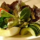 Die Salatbeilage mit frischen Zutaten, ein schöner Mix. Die Zutaten aber alle sehr grob, 1 großes ungeschältes Salatgurkenstück nur jeweils bis zur Mitte eingeschnitten. In dem tiefen Schälchen war es wirklich schwierig die groben Stücke und Blattwerke zu zerkleinern. Ein Minikleks Fertigdressing. Schade um die an sich knackigen Zutaten.