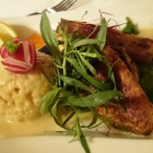 Der rechteckige Teller gut (zu gut) gefüllt. Ein grober Estragonzweig mittig platziert. Dieser musste erst einmal einen anderen Platz finden. Ein geschnitztes Radieschen nicht sehr stimmig.