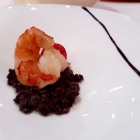 Als erstes Amuse eine wunderbar duftende, krachend-fleischige Garnele auf etwas belanglosen schwarzen Linsen. Dazu eine angegrillte halbe Kirschtomate mit etwas puristischer Balsamicokunst
