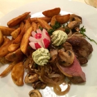 – rosa gebratene Lammhüfte, Kartoffelspalten, frische Pilze mit Schmorzwiebeln und Kräuterbutter (16,90 €). Ich entscheide mich auch für die Lammhüfte, allerdings mit einer Variation in den Beilagen:
