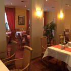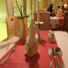 Das Palm-Restaurant macht einen sehr gediegenen Eindruck und ist durchgängig nicht nur für Hausgäste geöffnet (warme Küche von 12.00 Uhr bis 22.00 Uhr). Es gibt zusätzlich einen hellen Wintergarten, in dem die Tische etwas eng gestellt sind, was im Hauptrestaurant nicht überall der Fall ist. Zweier- und Vierertische mit harmonisch aufeinander abgestimmten Stoffdecken und Tischläufer sowie silberfarbigem Kerzenständer, frischer Blume, Salz- und Pfefferstreuer bestimmen das Bild, insgesamt eine warme, angenehme Atmosphäre. Die gesamte Tischgestaltung harmoniert mit der Farbgestaltung des Restaurants.