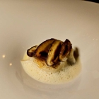 Der letzte (reine) Fischgang brachte eine kleine gegrillte Tranche Kabeljau, schön saftig, die einerseits klassisch mit Spinat, andererseits mit kräftigen Shitake-Pilze und einem wohltarierten Passionsfrucht-Schaum kombiniert war. Das war intelligent zusammen gestellt und „einfach“ lecker!